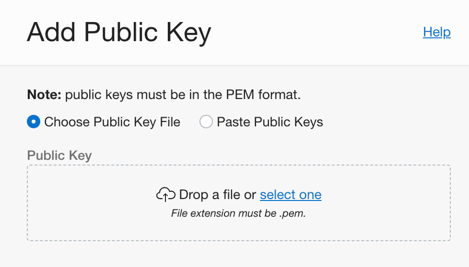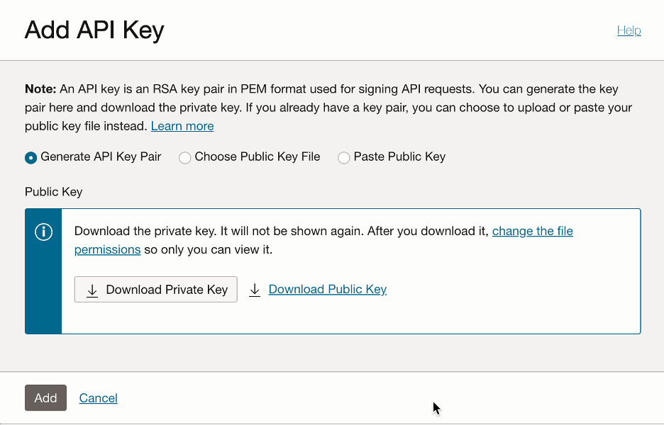 From there you’ll be taken to a very familiar user setup page. Just like in OCI, you’ll want to setup an API key. Here’s where things get a little different. In OCI, you’ll see a dialog like the image below where you can have OCI create your keys.
