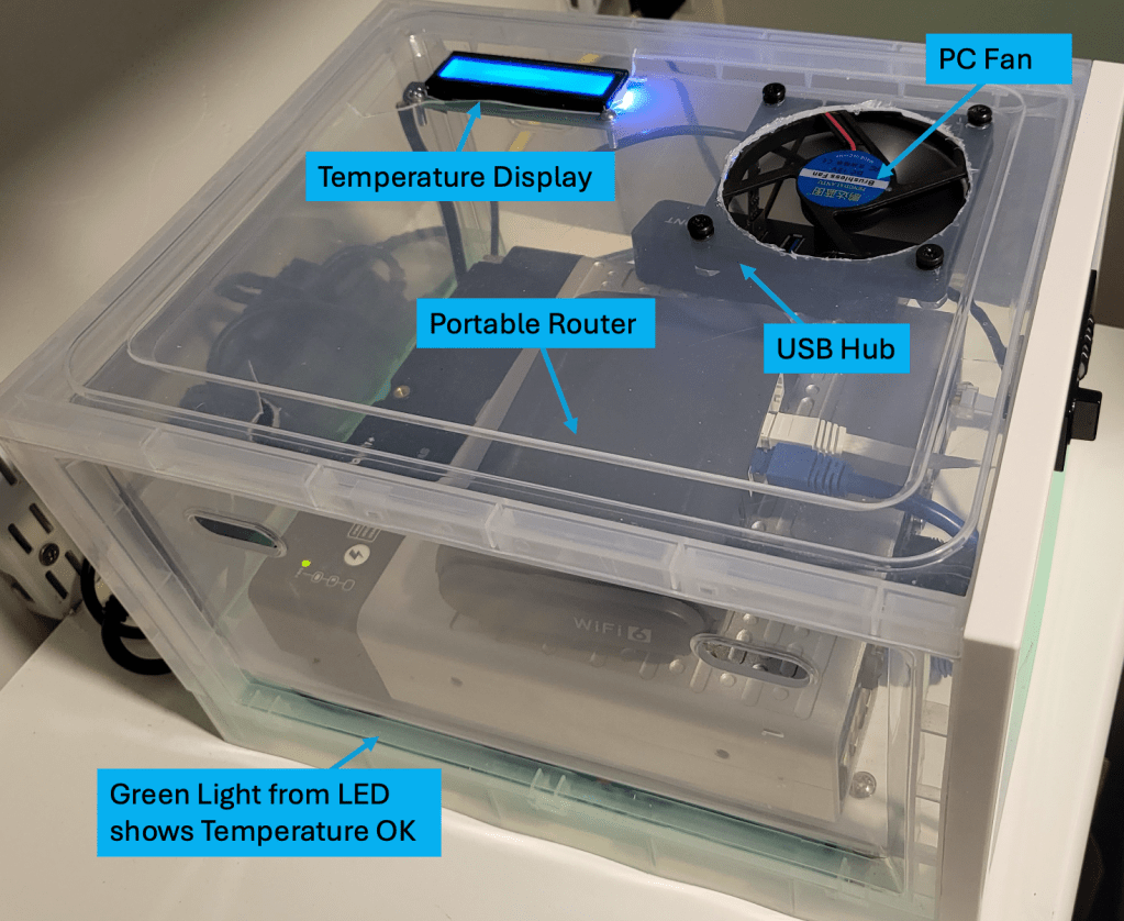 And for the last thing, we needed a case. We just went with a cheap plastic case for demonstration purposes, but the sky’s the limit here, as long as it’s the right size and has proper venting. We cut some holes for the fan and the temperature display. We were fortunate enough to have some holes already provided that allowed the air from the fan to circulate.