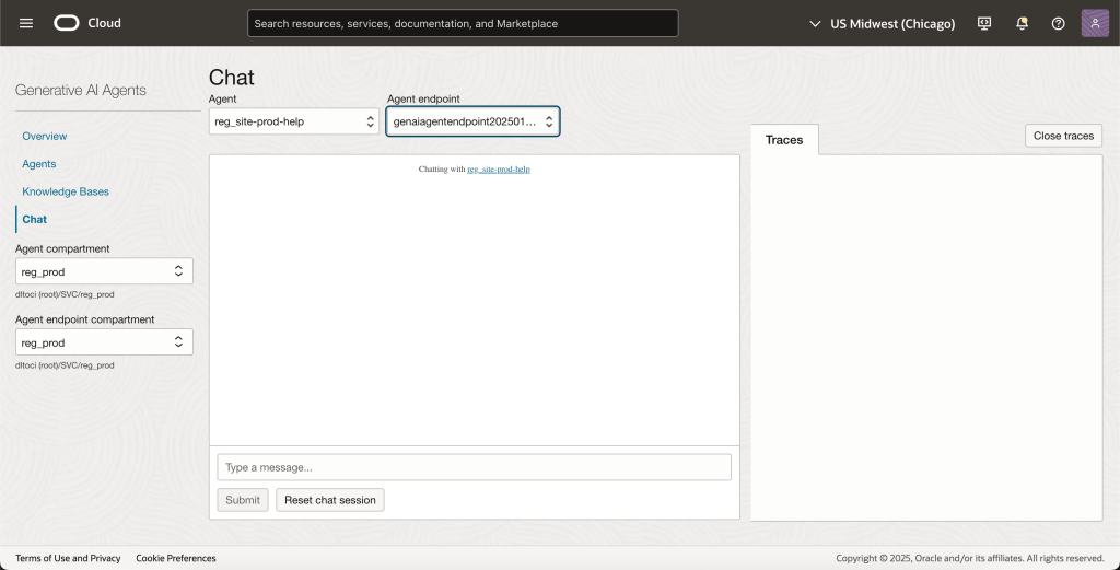 The fastest way to get using your Agent is to use the chat function in the OCI console. This is a great way to run tests and simply get to know the Agent. It’s also a good method to start working on your prompt engineering. This is important because you should consider how your users will leverage the Agent and determine if it makes sense to add additional context when submitting a user request to the Agent.